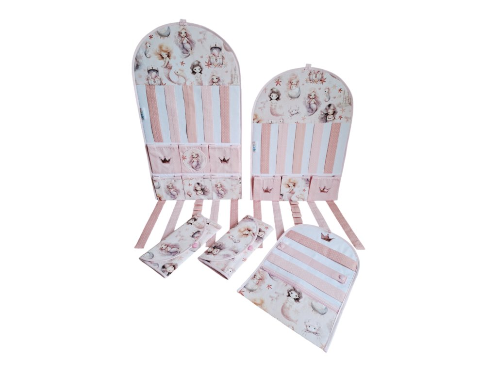 3 vrecká na gumičky, hrebeň či zrkadielko. Až 185cm pásikov na pripnutie sponiek a pukačiek a 8 tunelov na čelenky.