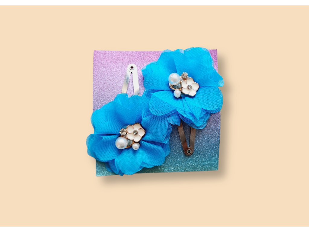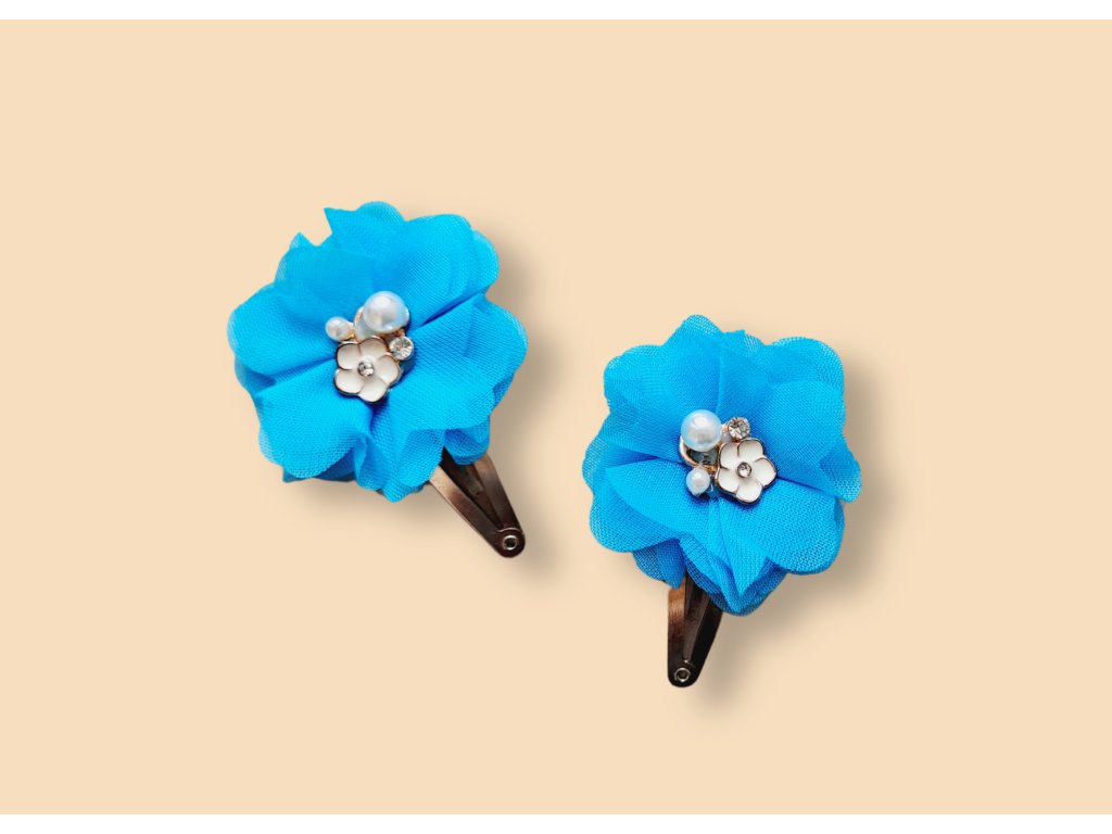 Modré kvetinové sponky s kovovou ozdobou s kvietkom. a perličkami. Pukačka má 5cm. Sponky sú lepené.